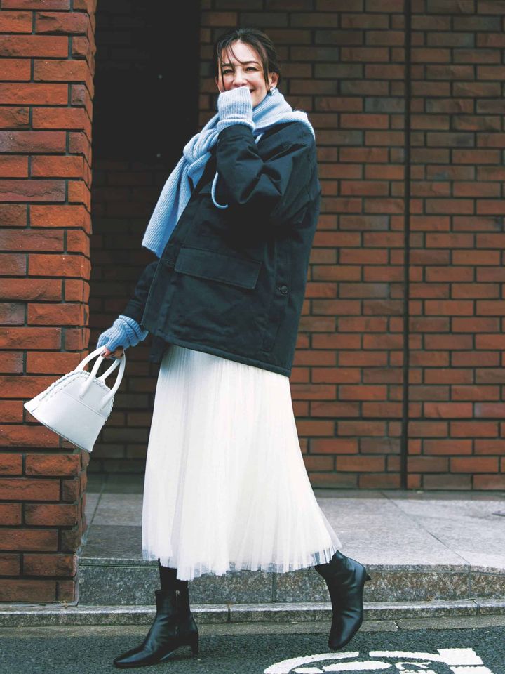 簡素な作りが魅力的なミリタリージャケット。ミドル丈なら腰まわりまで暖かさをキープできます。メンズなシェイプも可愛げなチュールスカートとMIXすればオジ見えの心配なし!