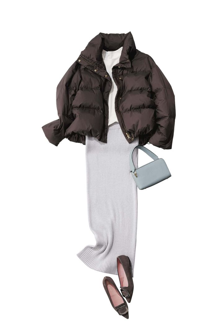 ブラウンダウンジャケット[撥水]¥26,990(TAION×UNFILO/アンフィーロ)トップス¥17,600(スタニングルアー/スタニングルアー 新宿店)リブニットタイトスカート¥27,500(LE PHIL/LE PHIL NEWoMan 新宿店)バッグ¥42,900(PUNTI./エルディスト ショールーム)パンプス¥40,700(プリティ・バレリーナ/F.E.N.)