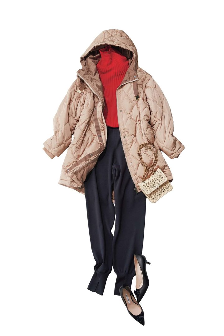 2WAYダウンジャケット¥59,400(YOSOOU/ジョワイユ)レッドタートルネックニット¥29,700ニットパンツ¥25,300(ともにLE PHIL/LE PHIL NEWoMan 新宿店)バッグ¥37,400(ノアム ハザン/ティースクエア プレスルーム)パンプス¥73,700(ネブローニ)