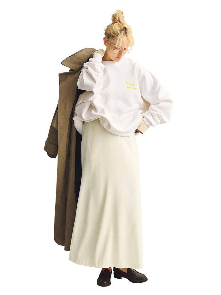【POINT】まっ白のスウェットに、黄みがかったオフ白のスカートで、白の中でもトーンに違いをつけるのがコツ。インナーにはベージュを仕込み、トレンチで輪郭を整えれば、気張らず、そのうえ膨張見えも防ぐ。