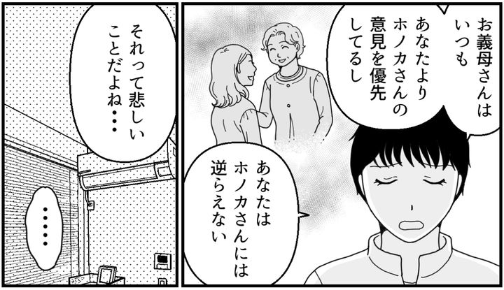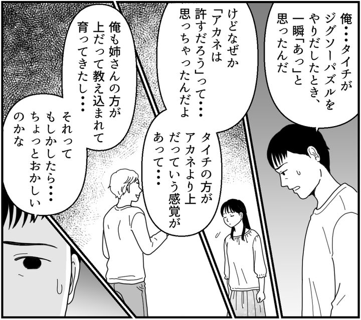 アカネが「タイチ君の方が上」という扱いを受けているように、夫は「ホノカさんの方が上」だと教え込まれて育ってきたようです。私は義両親が夫よりホノカさんを優先する場面を何度も見てきました。夫も思い当たることがあったようです。