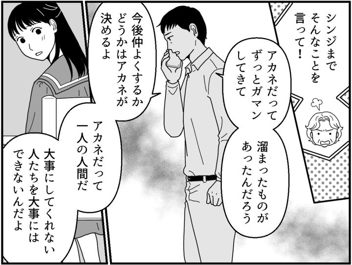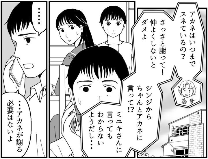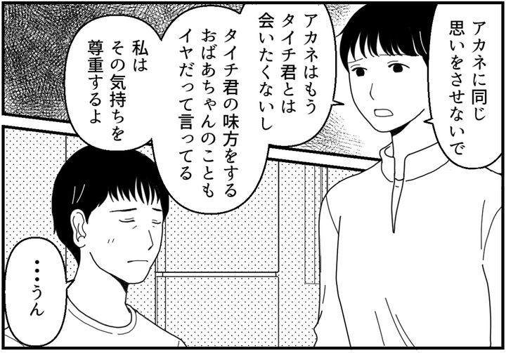 同じ孫の立場なのに優先順位をつけられて、タイチ君はなにをしてもかばわれて、アカネはなにをしても怒られる。そんな状況を夫もようやく理解してくれたようです。その後も義母は「早くアカネを謝らせて」と言ってきましたが……。