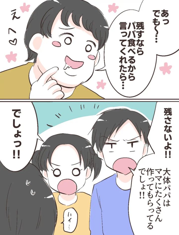 その後・・。「これは僕ので、こっちがサラ。それからこれがママの分!」テーブルに並んだハンバーグのお皿を1つずつ指さしながらフトシに説明したユウヤは「パパ!絶対に食べないでね!!」と念押し。「わ、わかってるって・・」とたじたじのフトシに、サラも「おやさい食べて!おいしいよ~!」とサラダを差し出しました。フトシが考えを改めて以来、私は家族みんなで一緒に食事をする形に戻しました。