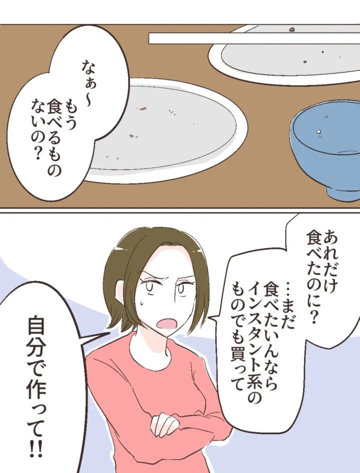 家族そろって食事が始まると、みんなよりもかなり多く用意されたフトシのごはんはあっという間に空っぽに。「なぁ~。もう食べるものないの?」と満たされていない様子のフトシに「あれだけ食べたのに?・・まだ食べたいんならインスタント系のものでも買って自分で作って!!」と呆れながら言いました。私が作ったもので足りない場合はフトシが自分で何とかするというルールになったのです。