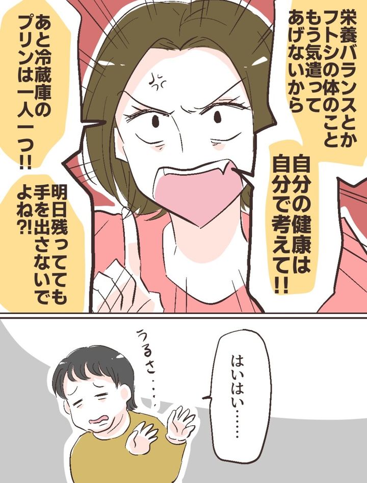 「栄養バランスとかフトシの体のこともう気遣ってあげないから!自分の健康は自分で考えて!!あと、冷蔵庫のプリンは一人一つ!!明日残ってても手を出さないでよね?!」と厳しく言ってもフトシは以前のように怒り出すこともなくなり「はいはい・・」と言ってそれ以上食べることを諦めて退散するようになりました。