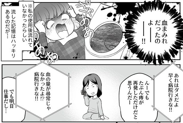 くぐりさん(以下、くぐり):母に通院するよう言われる3年前にも、いぼ痔で大量出血したことがありました。私としては出血には慣れていたし、「いぼ痔の再発だ」と思い込んでいたので、母の鬼気迫る剣幕に「そんなに急ぐことなの!?」と驚かされました。