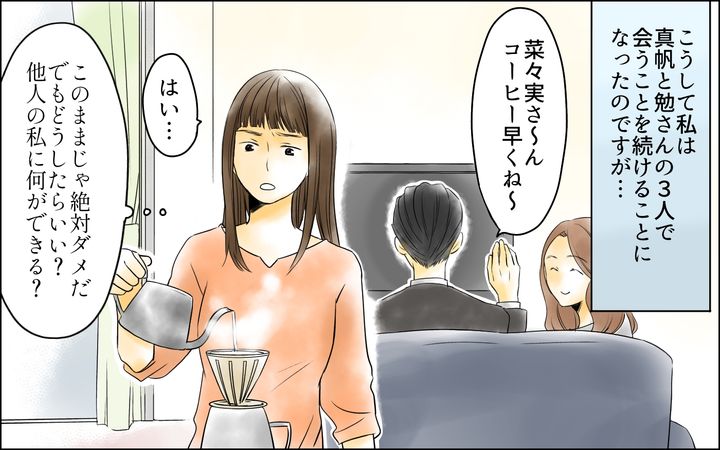 「会うのをやめないで!」「私を見捨てないで!」と真帆に言われた私は、真相を知っていながら、勉さんと真帆と3人で会う日々を続けることに……。