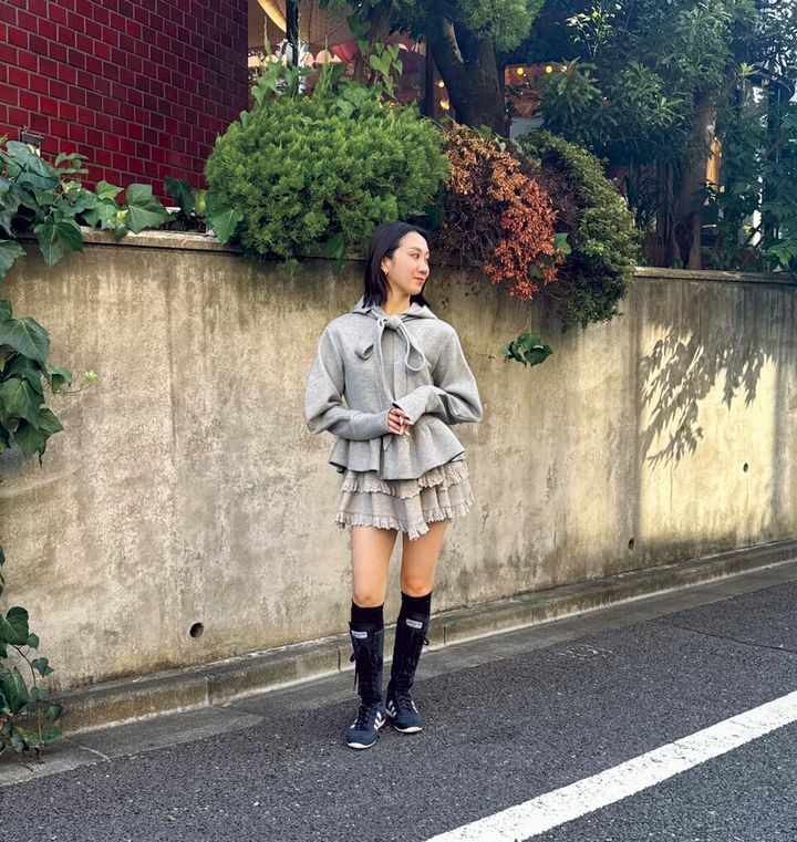 逆三角形のシルエットを作ってすっきりと見えるようにコーデ。大きめのフーディとレース付きのスカートは、セットアップで着るのが可愛くて好きです。特にフーディは袖にボリュームの あるデザインが◎。