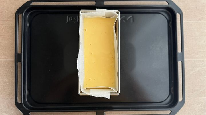 [B]を加えて混ぜ、レーズンも合わせる。型に流し入れ、やさしくトントンと型ごと台の上に落として空気を抜く。