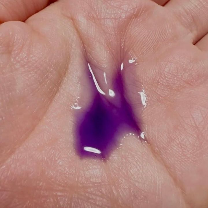 ムラシャンぐらいパープルの色素がしっかりついているのですが、手のひら全体に伸ばしてみるとシアーになるので、髪に纏った時も髪色をガラッと変えてしまうことはありません。