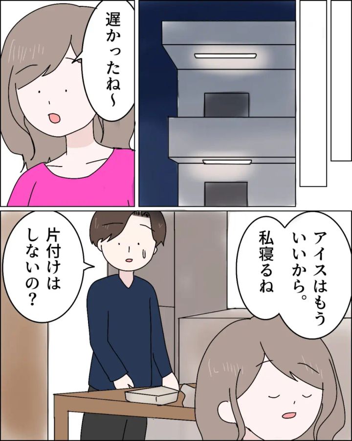 そして家に帰ると、「遅かったね~」とエリカさん。そして、「アイスはもういいから。私寝るね」そう言って寝室へ行こうとする背中に、「片づけはしないの?」とケイさんが言うと、