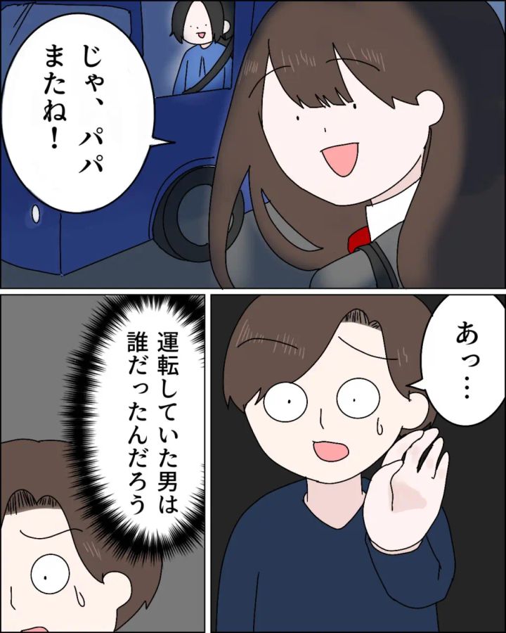「じゃ、パパまたね!」とジュリちゃんにそう言われ、「あっ・・」と手を振るも、「運転していた男は誰だったんだろう」気になったケイさんは頭の中でずっと考えていました。