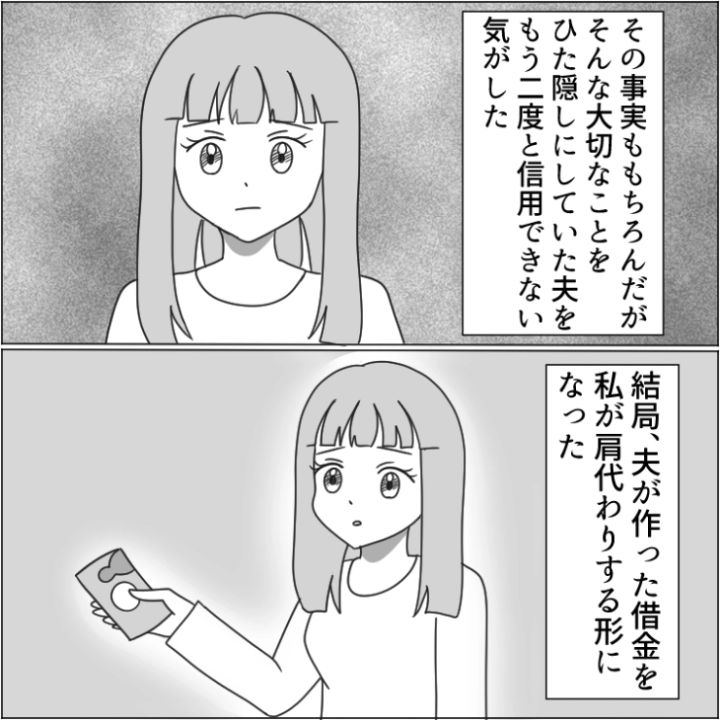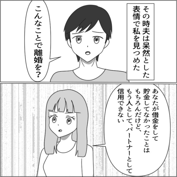 借金があったことはもちろん、それを長年隠されていたことでもうパートナーとしてはやっていけないと決意し、行動した主人公だったのでした。