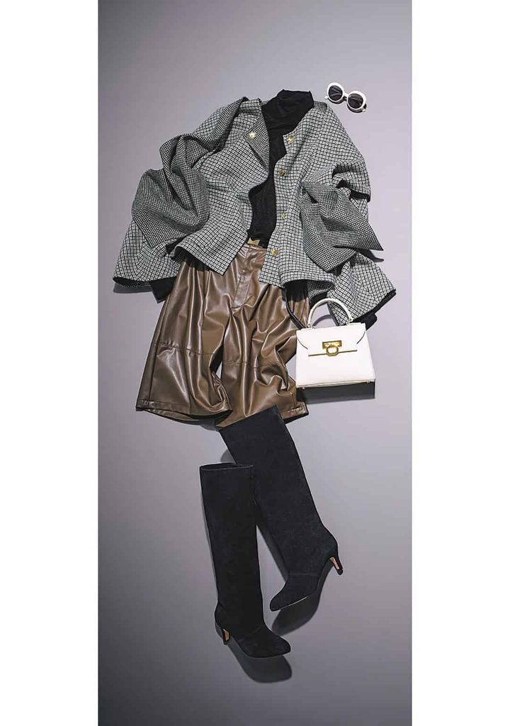 ハーフパンツもレザー素材&ロングブーツで冬モードに。きれいめジャケットと合わせて大人のきちんと感をキープしつつ、程よい攻めと女性らしさが両立。脚見せを控えたい日にも使えるテクです。