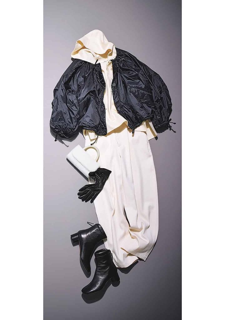 コート¥146,500(MARFA STANCE×Edition/エディション 表参道ヒルズ店)フードトップス¥94,600(エブール/リトルリーグ インク)パンツ¥36,300(ロエフ/エイチ ビューティー&ユース) バッグ¥84,700(サルチェ/フラッパーズ)ブーツ¥99,000〈ペリーコ〉グローブ¥23,100〈アルポ〉(ともにアマン)