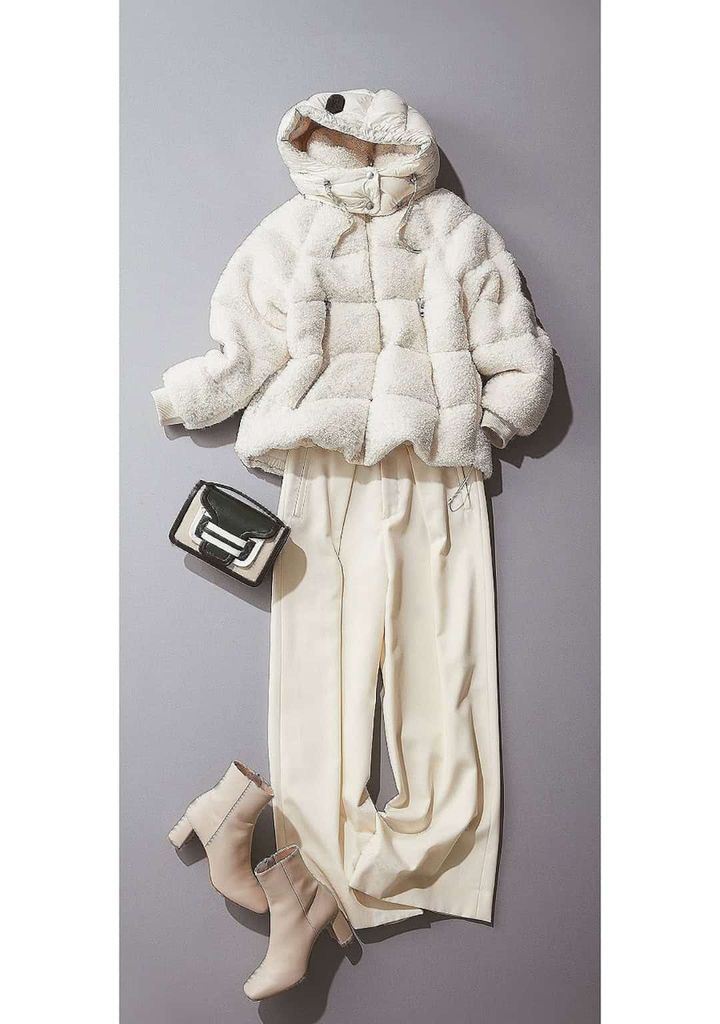 ボアのボリューム×白パンツのまっさら感で、冬らしい軽さをまとったワントーンコーデ。足元も白ブーツでつなげれば、ふんわり感の中に品が宿ります。重く見えない冬パンツの作り方に最適の着こなし。