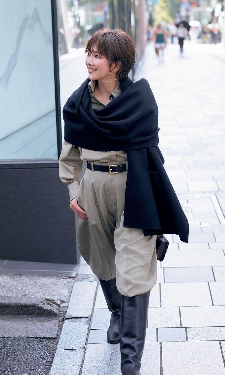 ストール付きコート¥253,000パンツ¥52,800(ともにサヴィル サヴィ)カットソー¥13,200(アンクレイヴ/オンワード樫山 お客様相談室)バッグ¥74,800(カルボッティ/essence of ANAYI)ブーツ¥121,000(ダブルスタンダードクロージング/フィルム)ベルト¥17,600(レフィエ/フラッパーズ)サングラス¥48,400(プロポ/プロポデザイン)