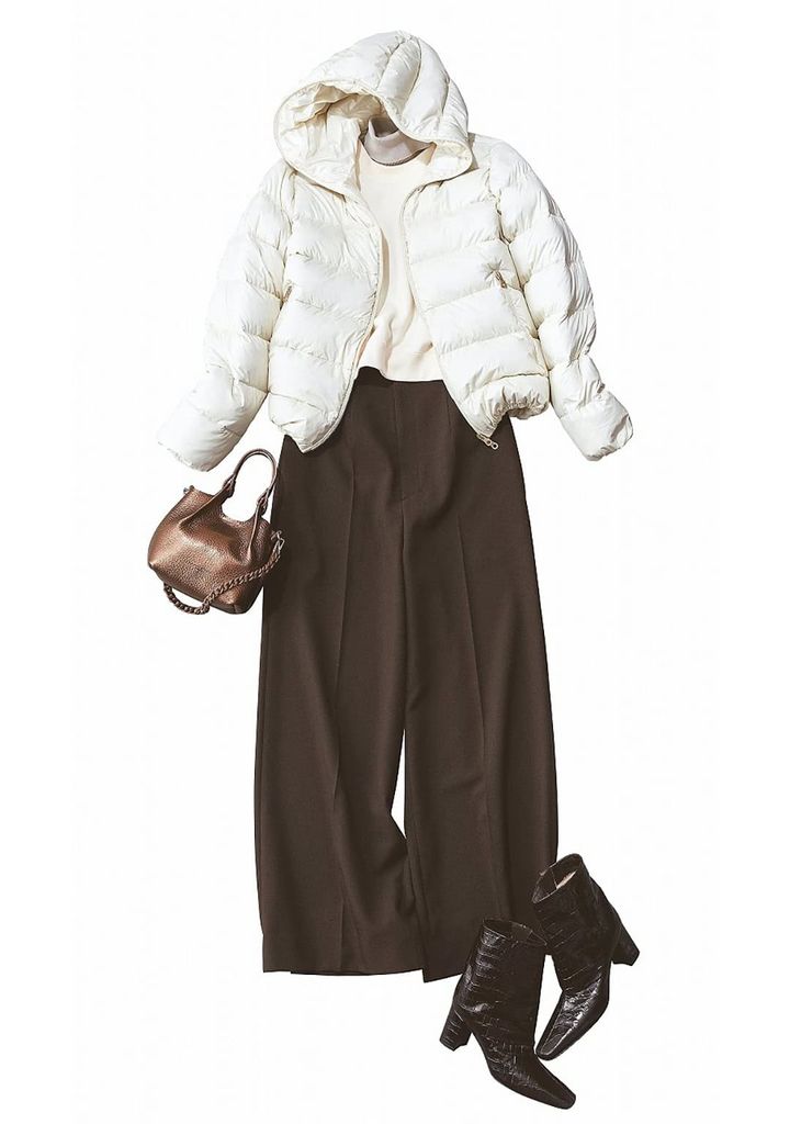 白ダウンに高級感あるレザーブーツが冬らしさと気品をプラス。クロコ型押し模様で足元をキリッとまとめれば、軽さと引き締めの好バランスに。シンプルコーデをワンランク上げてくれる組み合わせ。