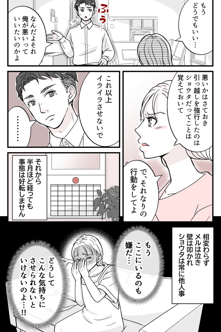私はホノカ。やっと引っ越した新居は段ボールの山。ショウタは手伝わないくせに文句ばかりです。夜になるとメルは落ち着かず夜泣きの嵐。隣でいびきをかくショウタに腹が立ちます。必死であやしますが泣き止まず、隣人からは壁ドンされてしまいました。パニックになる私とは対照的に、のんきに寝るショウタに怒りがこみ上げます。ショウタの身勝手な行動のせいで、メルも私もこんな目に遭っているというのに。この先どうなってしまうのでしょう。こんな日々がずっと続くのでしょうか……。