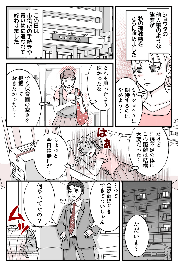結局メルが寝たのは明け方になってからでした。私は睡眠不足の頭でぼんやりと朝の準備をします。そんな私とは対照的にスッキリとした顔で起きてきたショウタに、昨晩の惨状を話すも「全然知らなかった」と言われてしまいました。ショウタの他人事のような態度が、私の孤独感をさらに強めました。
