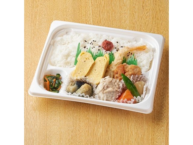 だし巻き玉子・から揚げ・海老の天ぷら・シュウマイ・オクラ、人参・大根の煮物・ほうれん草煮浸し・なす煮浸しを合わせた幕の内弁当です。 ※和歌山県の一部では取り扱いがございません。