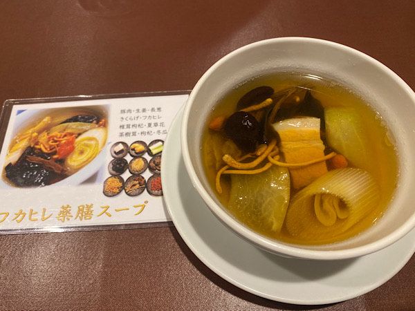 こちらが薬膳スープ。こちらも定期的に具材が変わります。薬膳スープは初体験でしたがクセもなく、美味しいスープでした。具材一つ一つにも効果があるそうで、美味しく健康管理ができている気分に^^