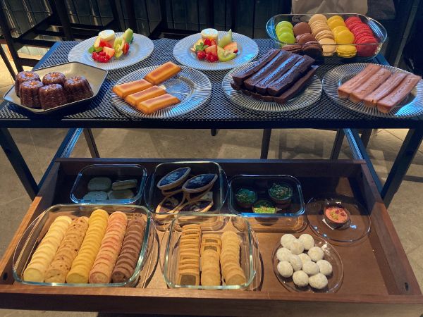 お待ちかねの焼き菓子ワゴンがこちら! 華やかなお菓子の中から、お好きなものを5つ選びます。 ずらりと並んだスイーツに、迷ってしまうこと間違いありません。