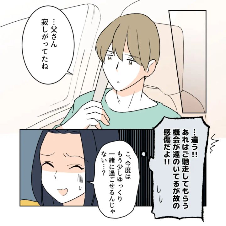 「・・父さん寂しがってたね」と呟くショウタに、「こ、今度はもう少しゆっくり一緒に過ごせるんじゃない・・?」と答えながらも、「・・違う!!あれはご馳走してもらう機会が遠のいてるが故の感傷だよ!!と心の中で叫びました。