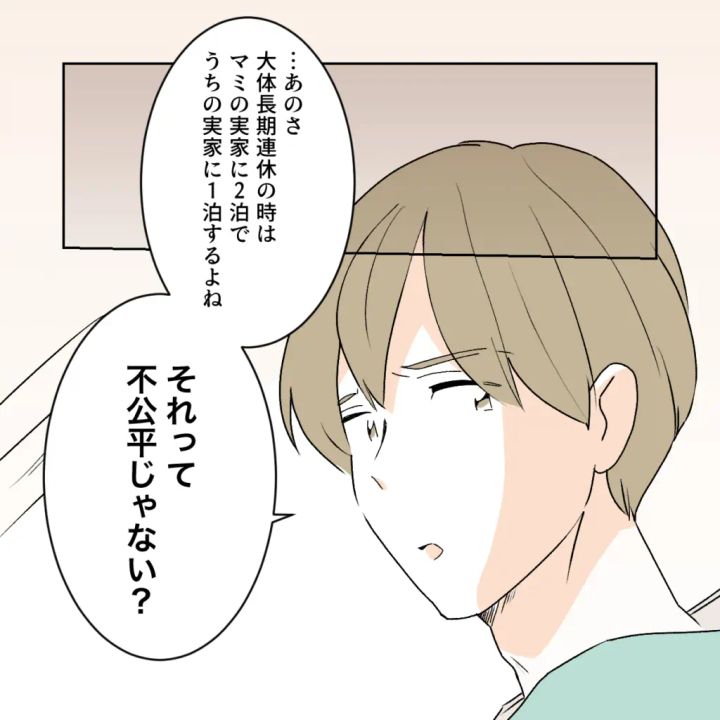 すると、「・・あのさ、大体長期連休の時は、マミの実家に2泊で、うちの実家に1泊するよね。それって不公平じゃない?」と真顔でショウタにそう言われました。