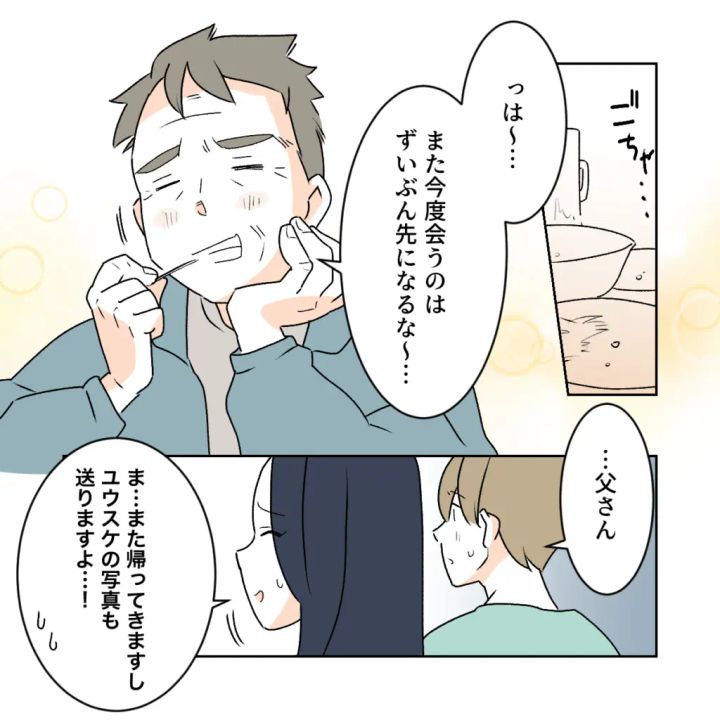そしてたらふく食べた後、「っは~・・また今度会うのはずいぶん先になるな~・・」義父がそう言うと、「・・父さん」としんみりした気分でそう呟くショウタ。その隣で「ま・・また帰ってきますし、ユウスケの写真も送りますよ・・!」義父に言いました。