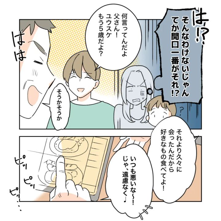 「は!?そんなわけないじゃん。てか開口一番がそれ!?」とうんざりしていると、「何言ってんだよ父さん!ユウスケもう5歳だよ?」笑顔で答えるショウタに、「ははっ、そうかそうか」と義父が答えました。