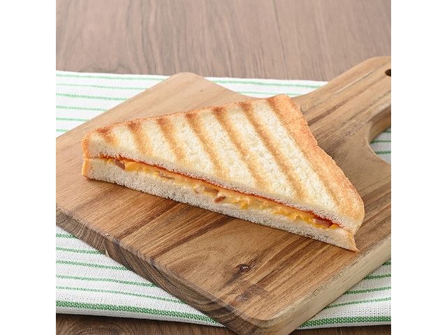 ベーコン入りのスクランブルエッグとチーズ、トマトソースをサンドし、ハーフカットして焼き上げたホットサンドです。