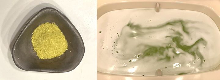オレンジイエローのソルトが、溶かすとミルキーグリーンの濁り湯に。複合的なハーブの香りに癒される。