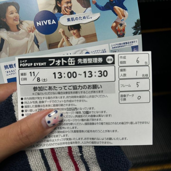 先着順なので、早めに行くのがおすすめです👍整理券をもらう際に、注意事項やオリジナル缶の個数、フレームデザイン、画像データの有無などを伝えて準備OK。時間になったら撮影ブースへ。