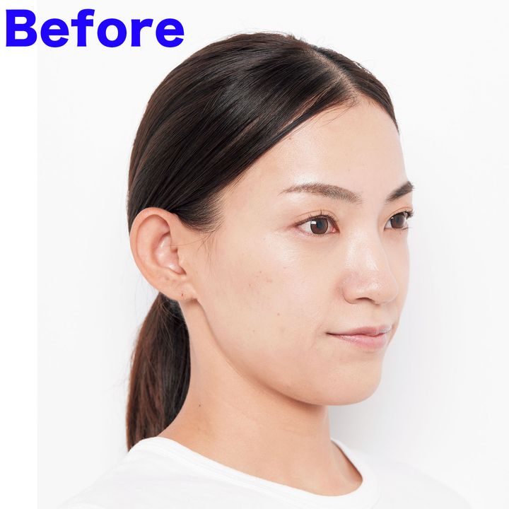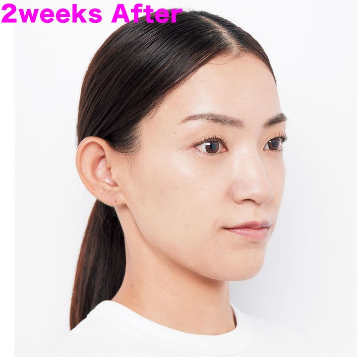 あご下のゆるみがみるみる改善。2週間でフェイスラインがくっきり。35日後は頰も高さがアップしてツヤツヤに。元々たるんでなくても、キュッと一回り小顔になった印象。