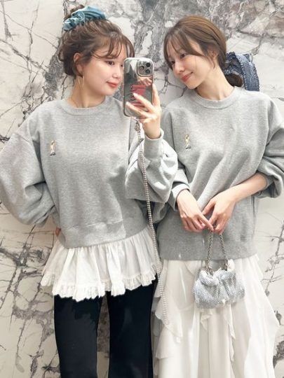 まず紹介したいのは、emmiで人気のラメ入りスウェット生地のプルオーバー。ペプラムシルエットで大人フェミニンさを加えながらも、自由なスタイリングが楽しめます。身体のラインを気にせず着ることができるゆとりのあるシルエットは、こなれ感を演出し、着心地も快適!