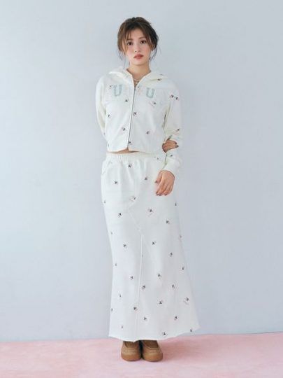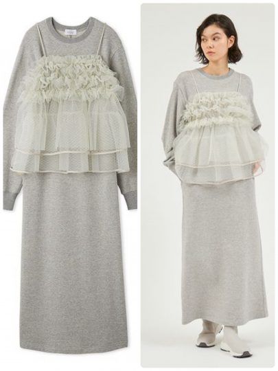 2素材のチュールを組み合わせて仕上げたビスチェと裏毛のワンピースのセットアイテム。セットではもちろん、別々でも着回し力抜群なアイテムです。