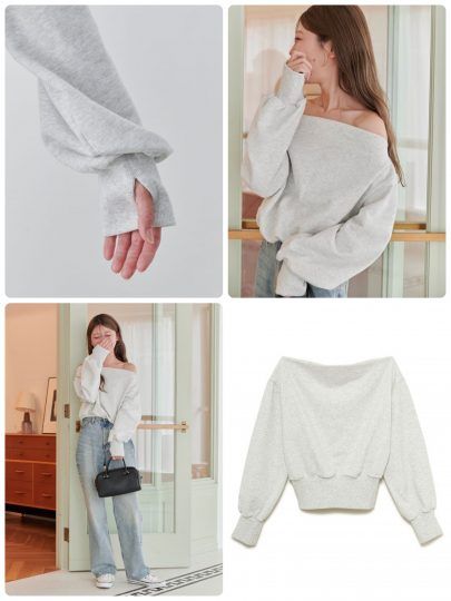 オフショルダーが目を惹くスウェットトップスは、きれいめな表面感の裏毛素材を使用。切り替え部分をあえてリブ仕様にしないことで、カジュアルすぎずきれい見えする仕上がりになっています。ゆるっとしたボリューム袖と、裾のリブで引き締まるクロップド丈のシルエットが、全体をすっきりと見せてくれます。