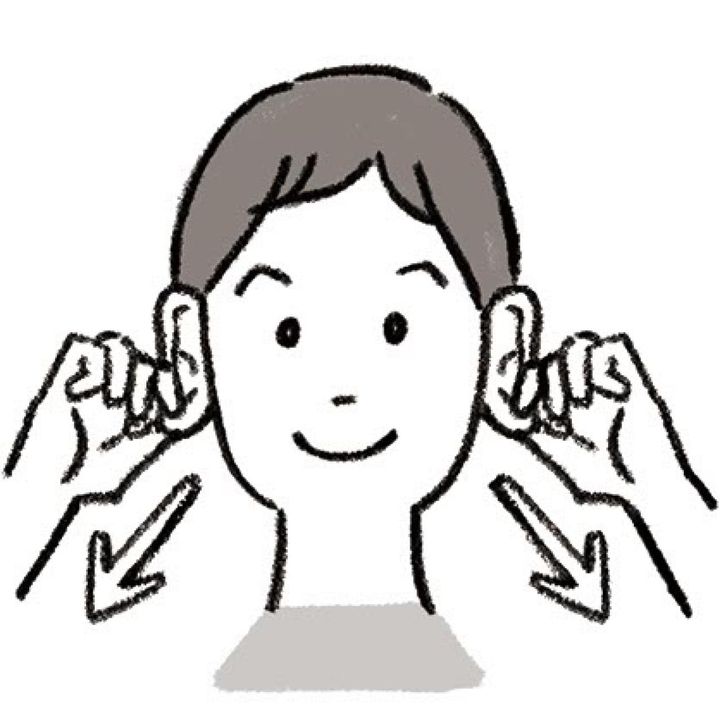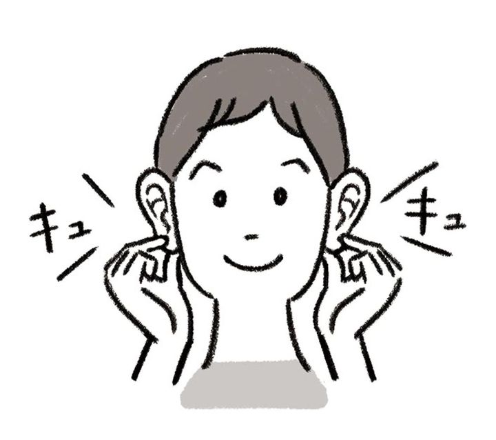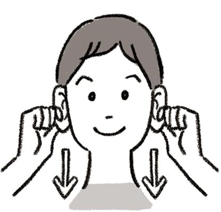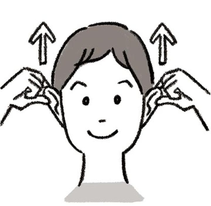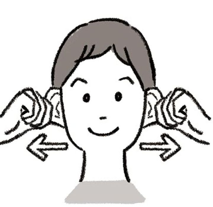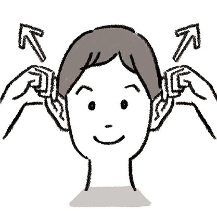 耳の皮ふを指でつまみ、上に3秒軽く引っ張る。下・斜め上・斜め下・横、それぞれの方向にも同様に3秒ずつ引っ張る。