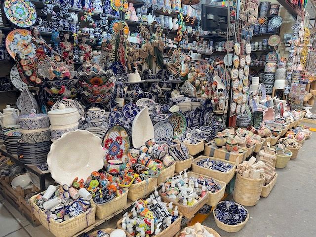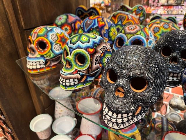 小さな通りにぎっしりと並ぶのは、手刺繍のポーチやアクセサリー、メキシコらしいドクロモチーフの置物、カラフルなバッグなど、見ているだけで楽しいアイテムばかり。市場は観光地価格ではなく、ローカルプライスで購入できるのも魅力。少しだけ値段交渉を楽しめば、掘り出し物を手に入れられることも。