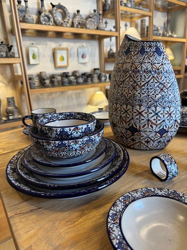 セルビン焼の特徴は、なんといってもその緻密な模様と鮮やかな色使い。ブルーを基調にした繊細な線のパターンは見る角度によって印象が変わり、まるで宝石のような輝きを放ちます。絵付けはすべて職人たちの手によるもので、絵柄のわずかな揺らぎが“手仕事の証”として世界中のファンに愛されています。