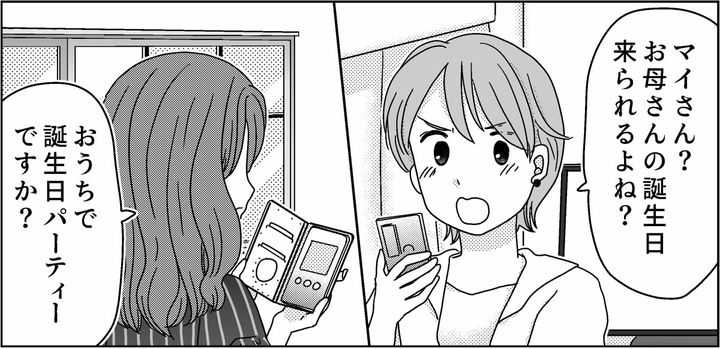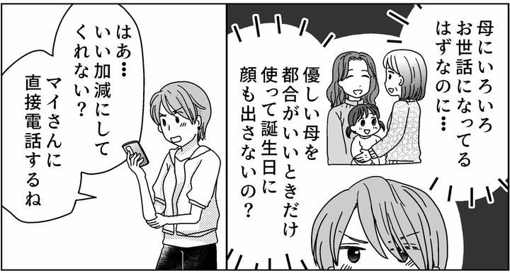 せっかく母の誕生日をみんなでお祝いしようと企画しているのに、弟は母の誕生日にも顔を出さないと言うのです。母にはお世話になっているはずなのに。優しい母を都合がいいときだけ使うなんて……あんまりではありませんか? 今回は私も我慢の限界。弟の嫁マイさんに電話をすることにしたのです。