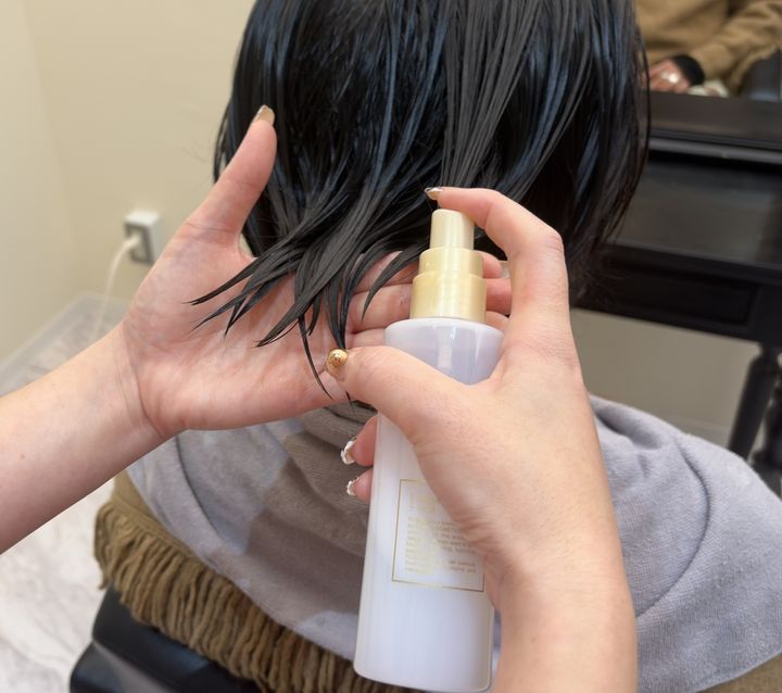 仕上げは、シルク成分配合のアウトバストリートメント‟リペアコンクミスト”。タオルドライした髪に塗布し乾かすことでドライヤーやアイロンによる熱ダメージをブロックし、しなやかでサラサラな髪に。また、最後にストレートアイロンを軽く入れることでトリートメントの持ちが良くなり、補修された髪がさらに強化されるとか。熱は髪に良くないイメージがありますが、髪について熟知しているヘアケアメーカー「デミ コスメティクス」ですから、熱も味方にしているのです。