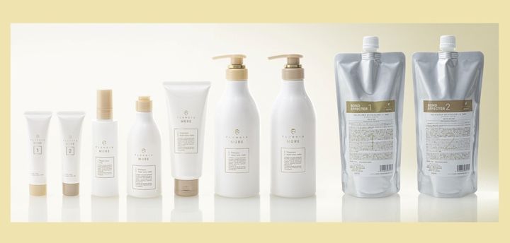 「FLOWDIA MORE」のヘアケア全7アイテム、サロンケア2アイテム。インバスそしてアウトバスがラインナップされていて、サロントリートメント以外にホームケアも併用すると美髪期間が延びるとか。