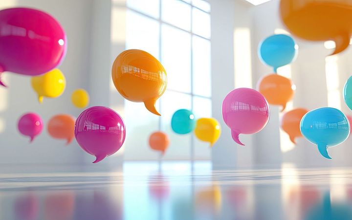 Elegant group of floating, glossy chat bubbles in a bright, minimalist room setting. Ideal for illustrating modern communication and tech concepts.