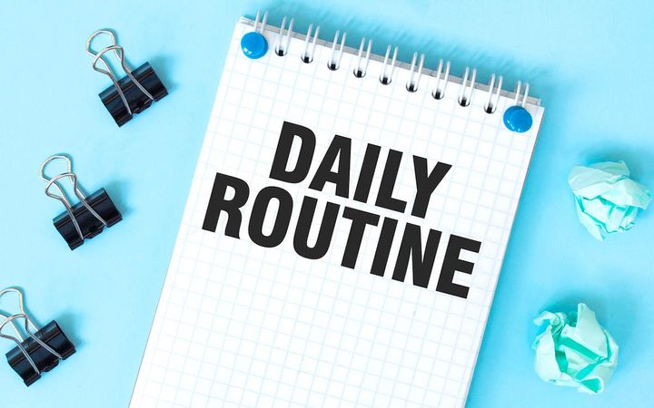 White notepad with text DAILY ROUTINe and office tools on the blue background