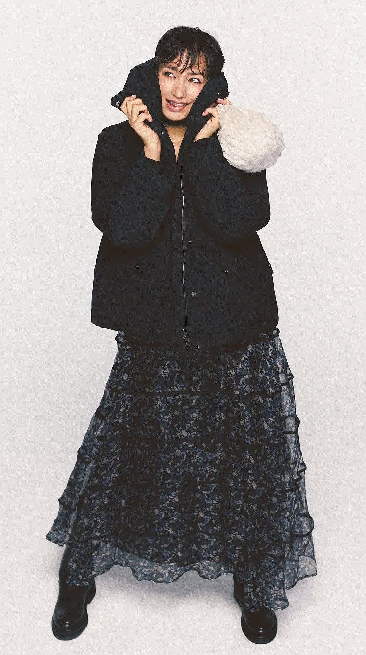 氷点下でも寒さを感じにくい暖かさに加えて、高めのスタンドカラーとリブ袖で風までしっかりガード。華やかスカートとも好相性で、全体を引き締めつつ大人カジュアルに品を添える一着です。