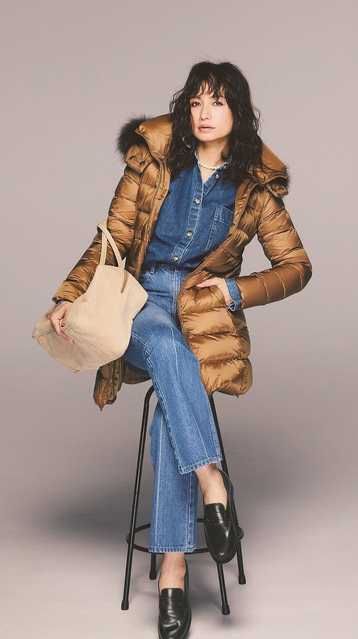 ダウンジャケット¥195,800(タトラス/タトラス カスタマーセンター)デニムシャツ¥66,000(アキン/ユナイテッドアローズ 麻布台ヒルズ ウィメンズストア)デニムパンツ¥28,600(ネイル/エストネーション)バッグ¥49,500(モフィオラ/アマン)ローファー¥156,200(J.M. WESTON/ジェイエムウエストン 青山店)ネックレス¥101,200(ビジュードエム/ビジュードエム六本木ヒルズ)