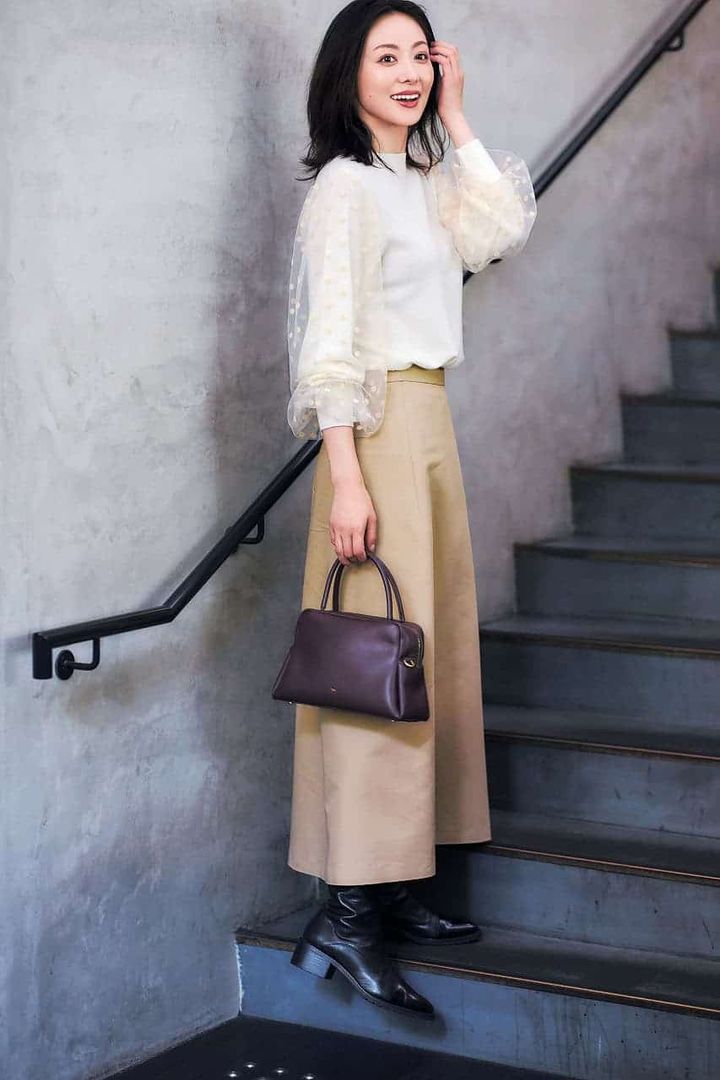 リボンデニムブラウス¥18,700(シークレット・トロフィー)スカート¥24,200(アルページュストーリー)バッグ¥69,300(マエストソ/オブリオ)ブーツ¥60,500(ツル バイ マリコ オイカワ)ピアス¥7,700〈MU〉リング[左手人さし指・中指]¥3,520〈ヘンカ〉リング[左手薬指]¥27,500〈mysha〉リング[右手]¥31,900〈Pearl for Life〉(すべてロードス)