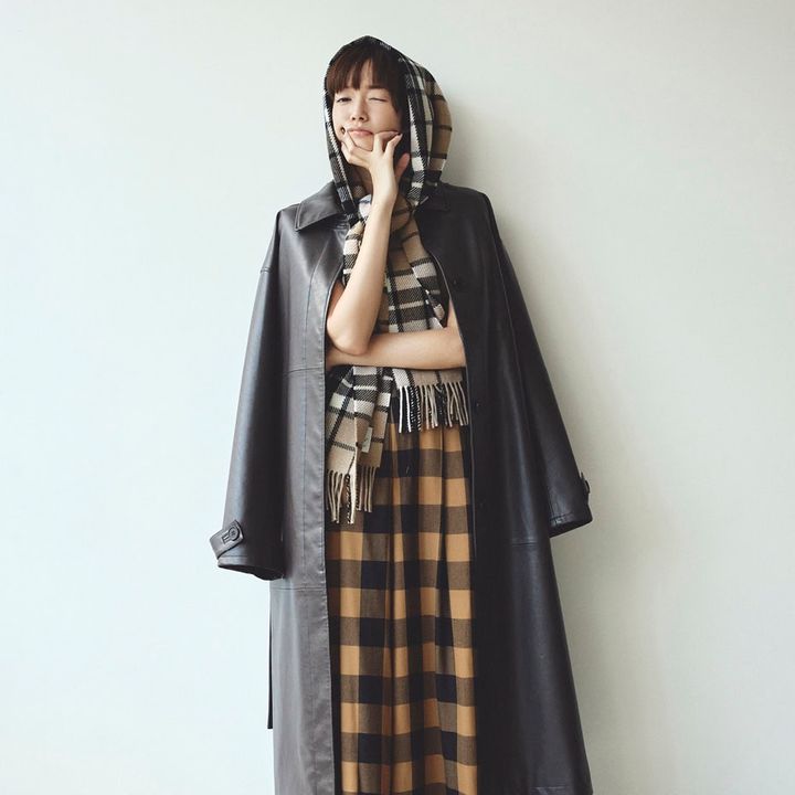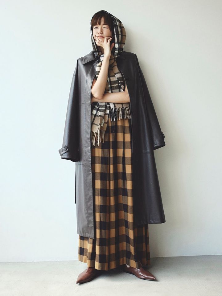 レザーコート¥42,900(シールームリン/シールームリン 神宮前店)、チェックパンツ¥50,600(ハイク/ボウルズ)、頭に巻いたストール¥39,600(トラディショナル ウェザーウェア/トラディショナル ウェザーウェア 渋谷店)、シューズ¥49,500(フミエタナカ/ドール)